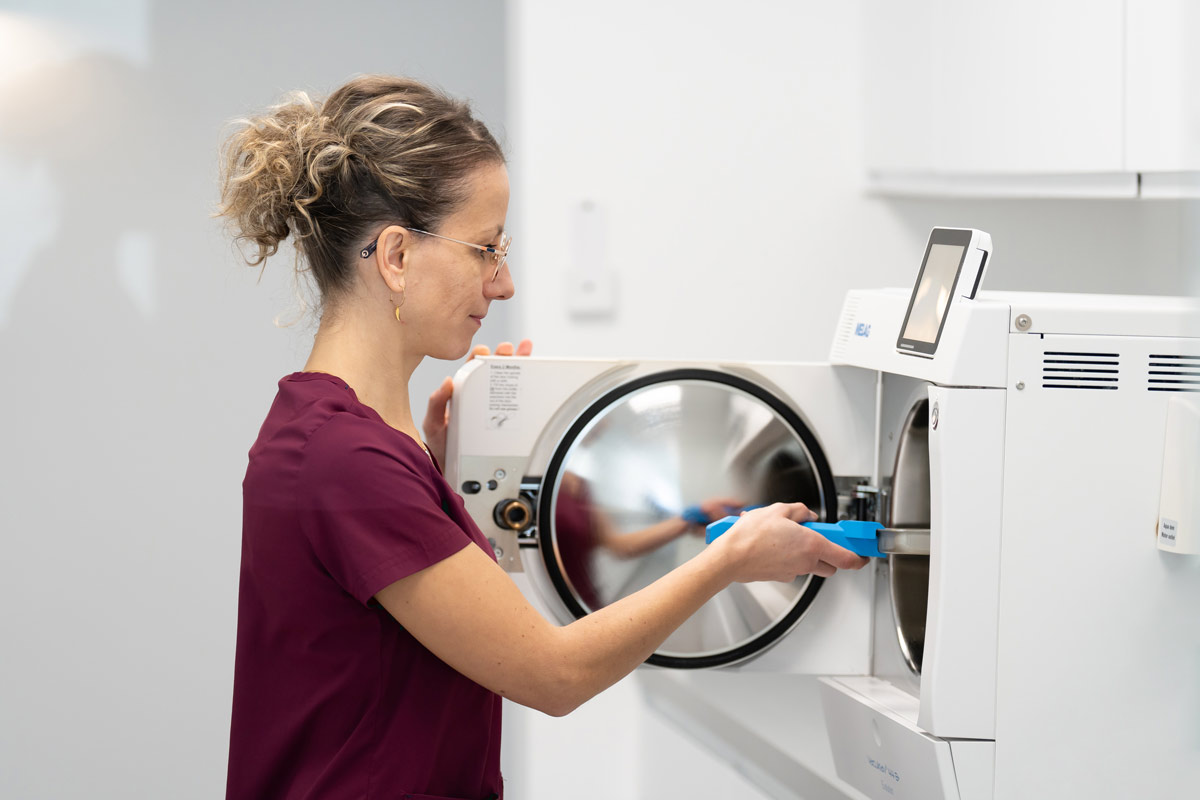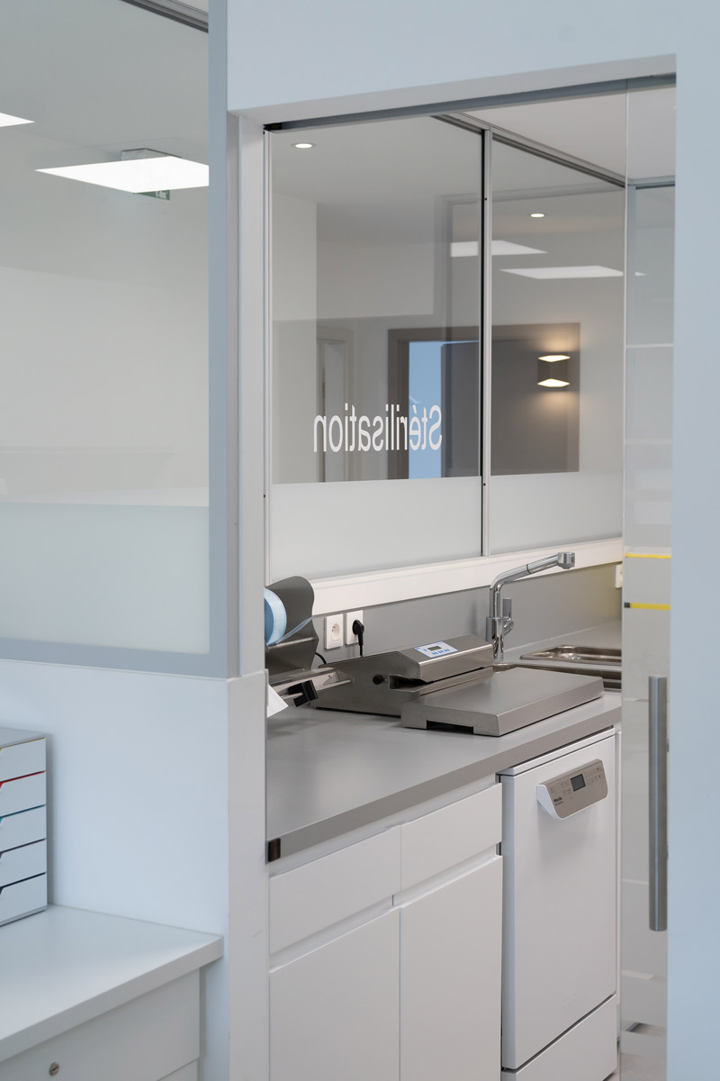 Le cabinet comporte également un appareil radiologique panoramique 3D (cone beam) qui permet de scanner l’intégralité de vos mâchoires en 3D afin de réaliser le diagnostic. La chaîne de stérilisation est équipée avec des appareils conformes aux derniers standards (thermo-désinfecteur Miele et autoclave Melag).